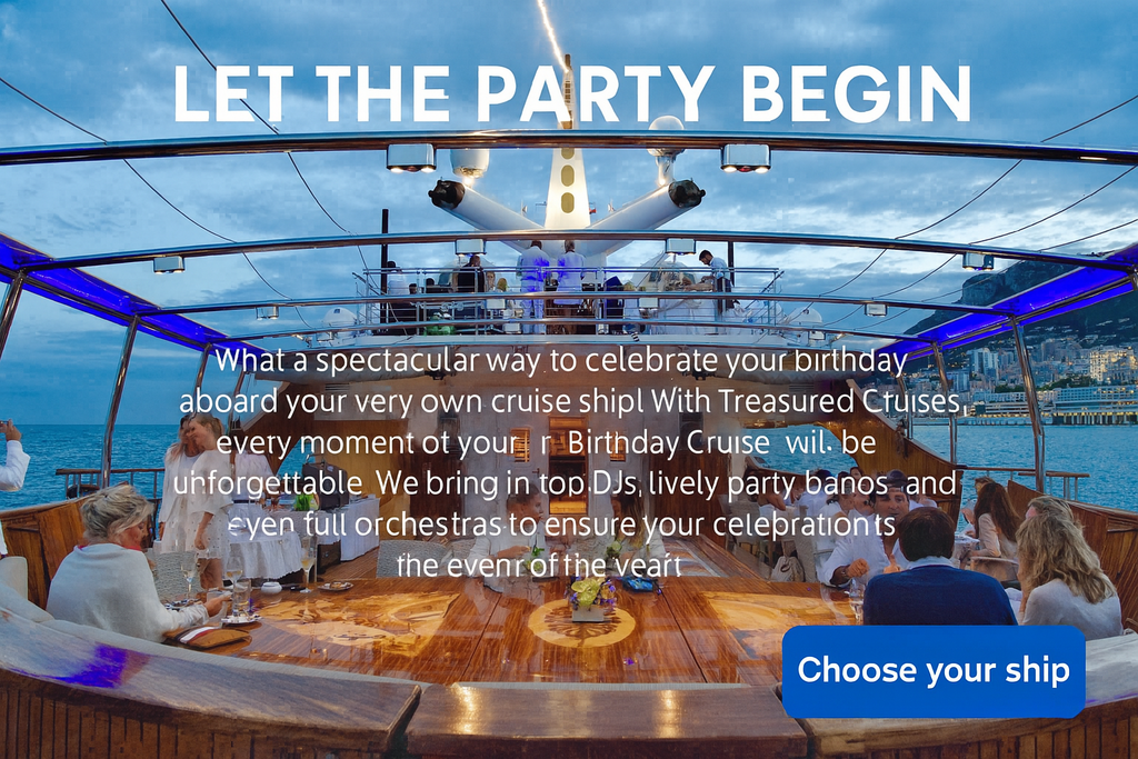 Are you dreaming of an extraordinary way to celebrate your birthday? Imagine hiring a stunning cruise ship for this special occasion! Whether you're envisioning a journey through the breathtaking Mediterranean, the vibrant Caribbean, the idyllic South Seas, or the enchanting landscapes of Northern Europe, Treasured Cruises is here to bring your vision to life. We specialize in crafting memorable events tailored to your desires, accommodating any destination and any number of guests.